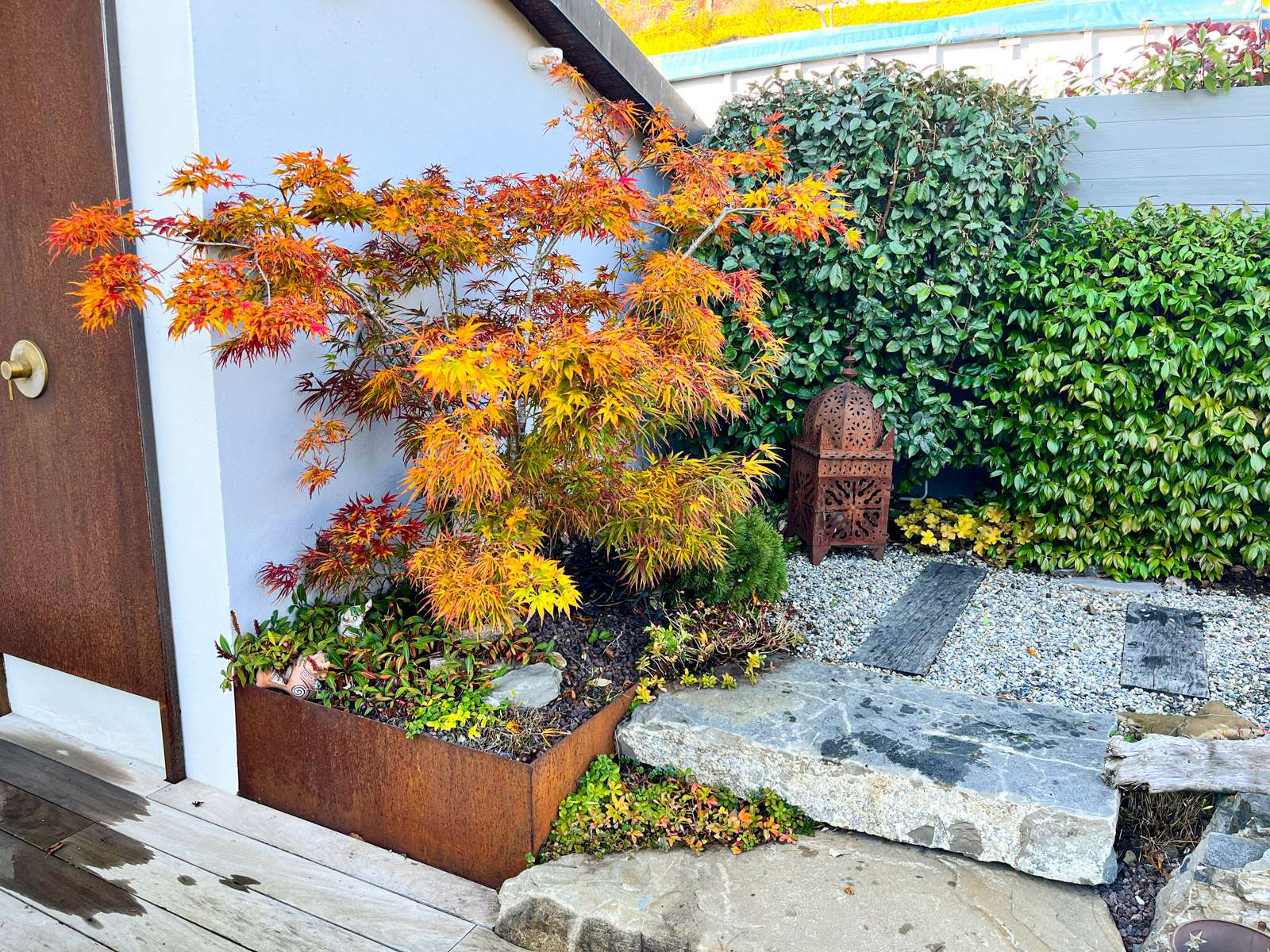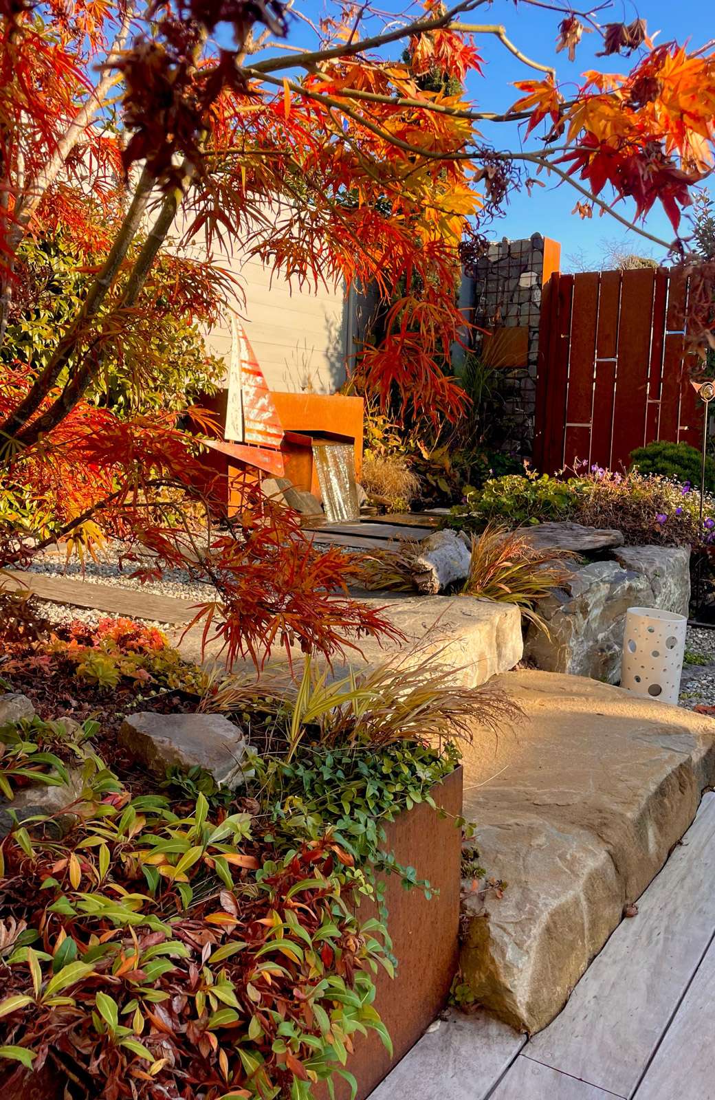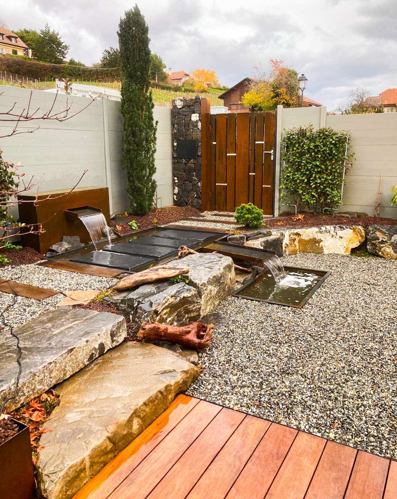 Aménagement d’un charmant jardin clos avec la réalisation d’une double fontaine et d’un portail en acier, la pose de marches en pierres naturelles, d’une terrasse en bois et des plantations diverses