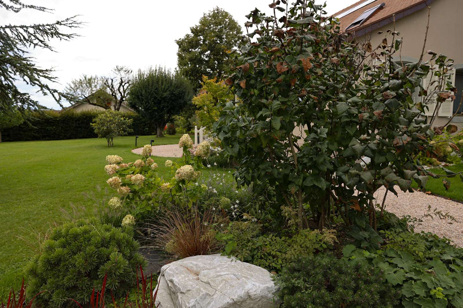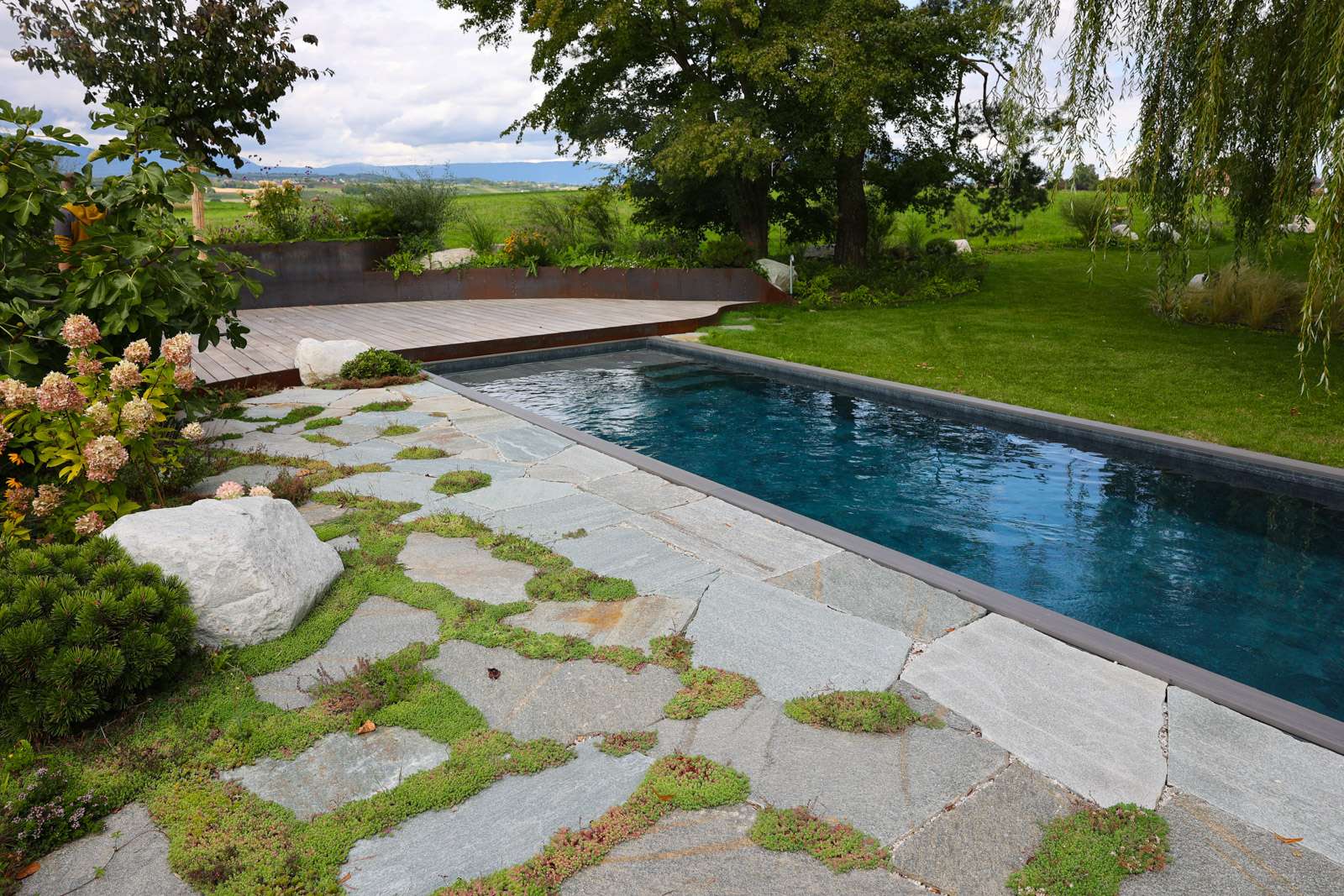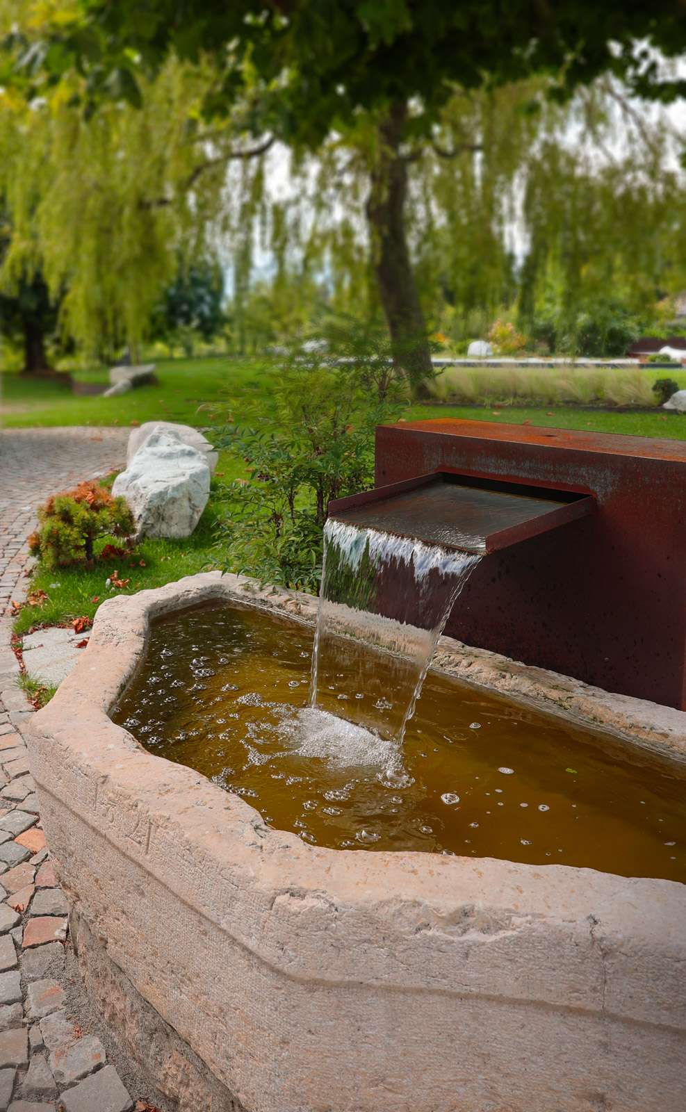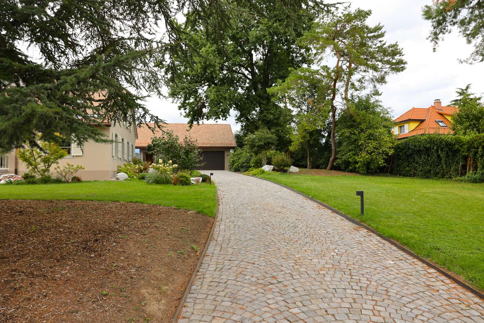Réalisation de bordures et de bacs en acier, travaux de terrassement, pose de revêtements, réhabilitation de la fontaine de l’ancienne abbaye de Morges, plantations et entretien dans une magnifique propriété