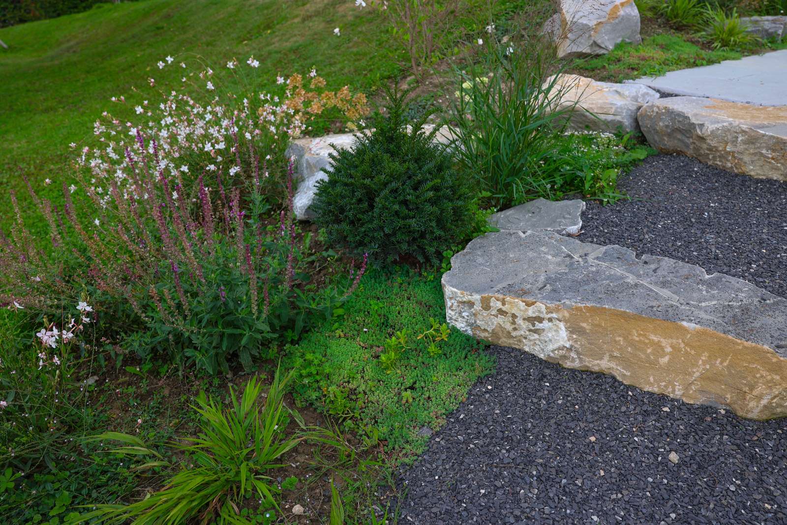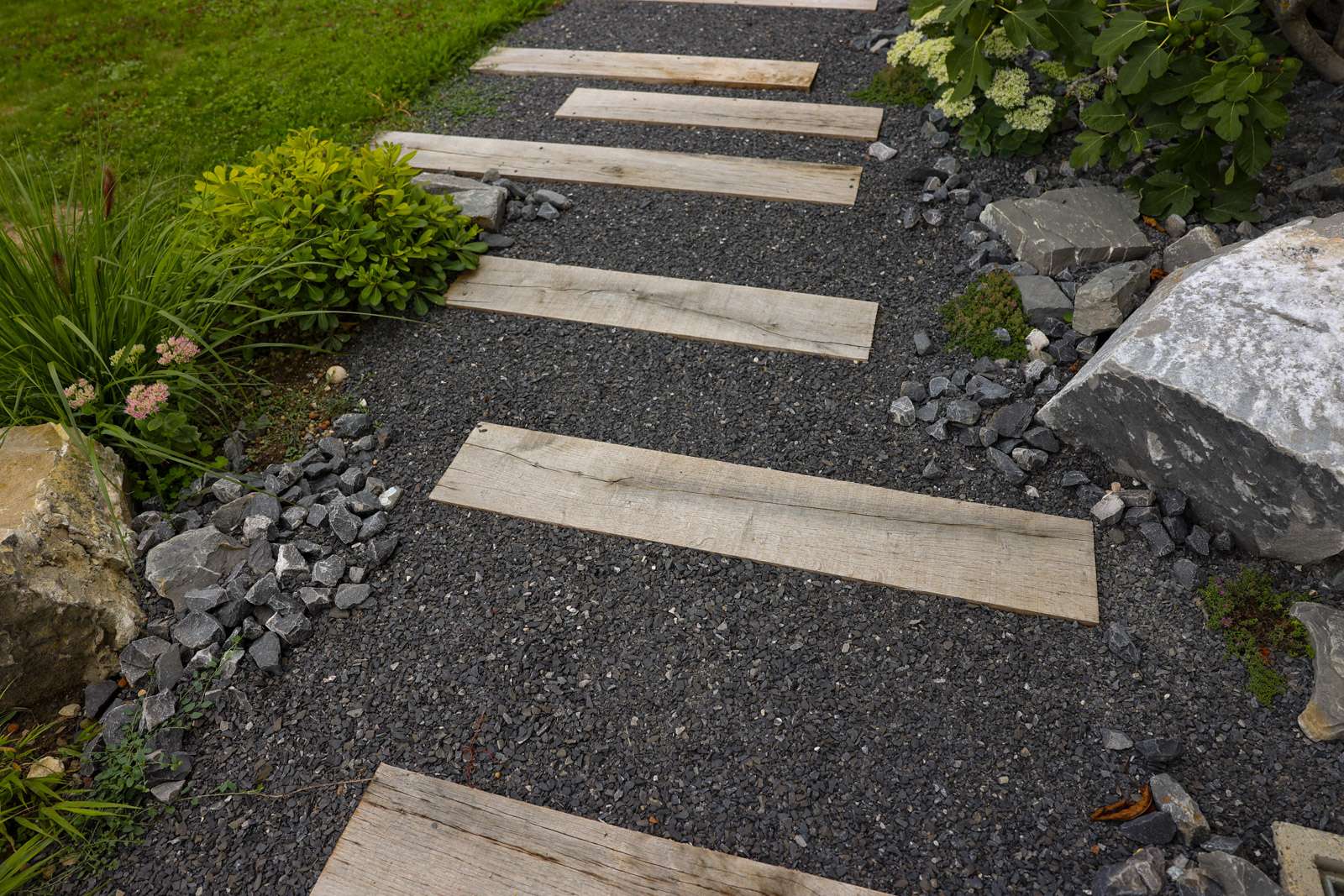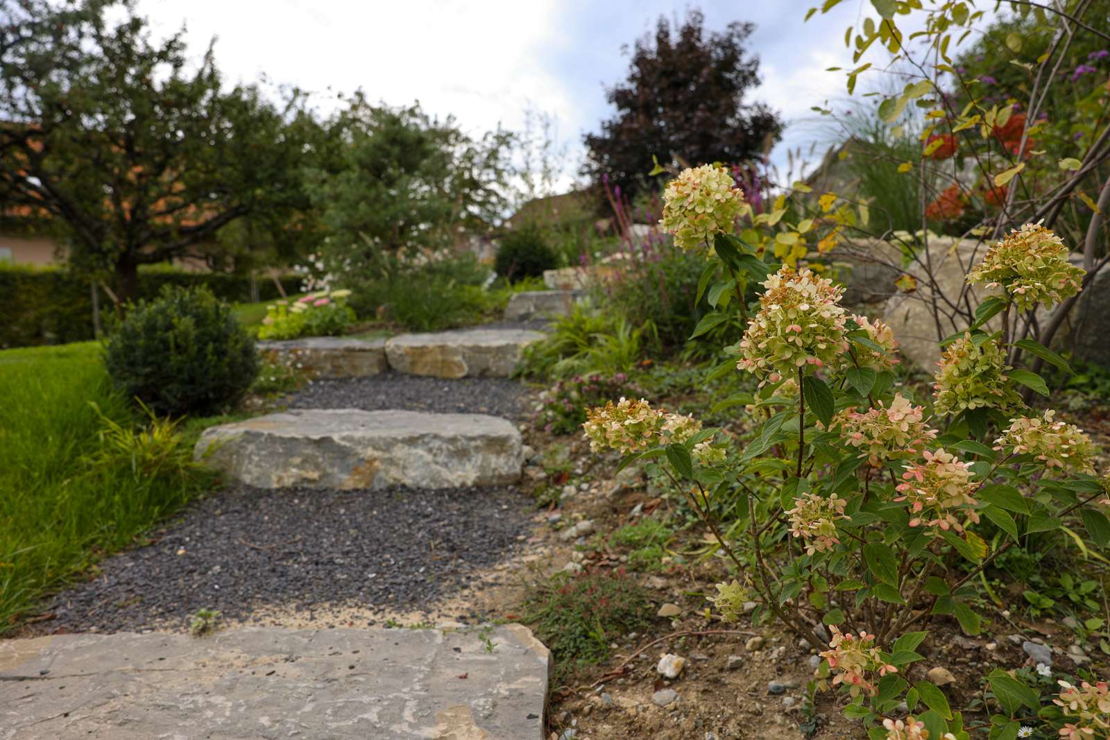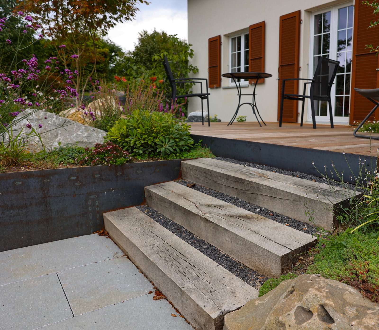 Escaliers et revêtement en pierres naturelles, terrasse en bois, passe-pieds et marches en poutres de chêne, plantations diverses autour d’une villa