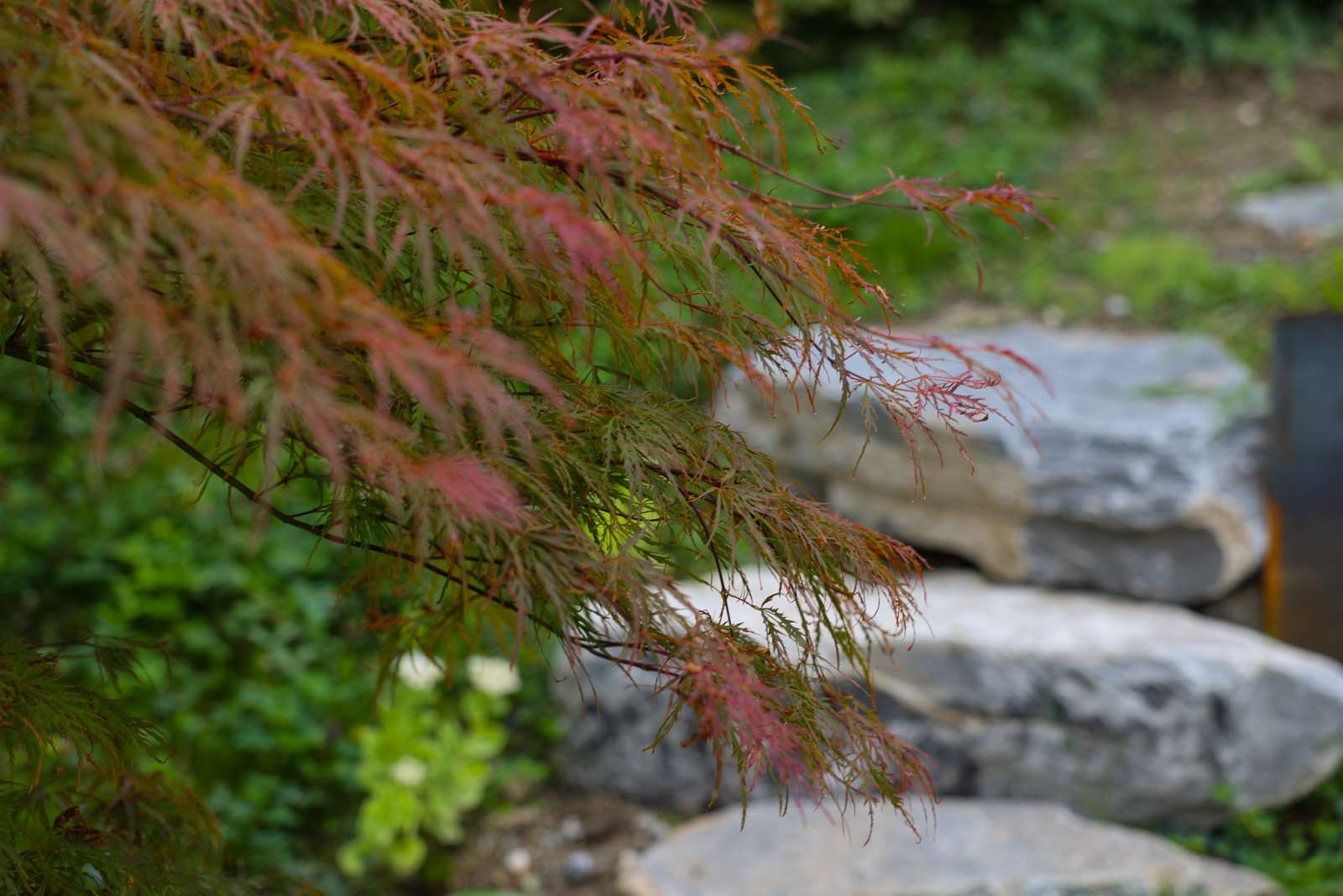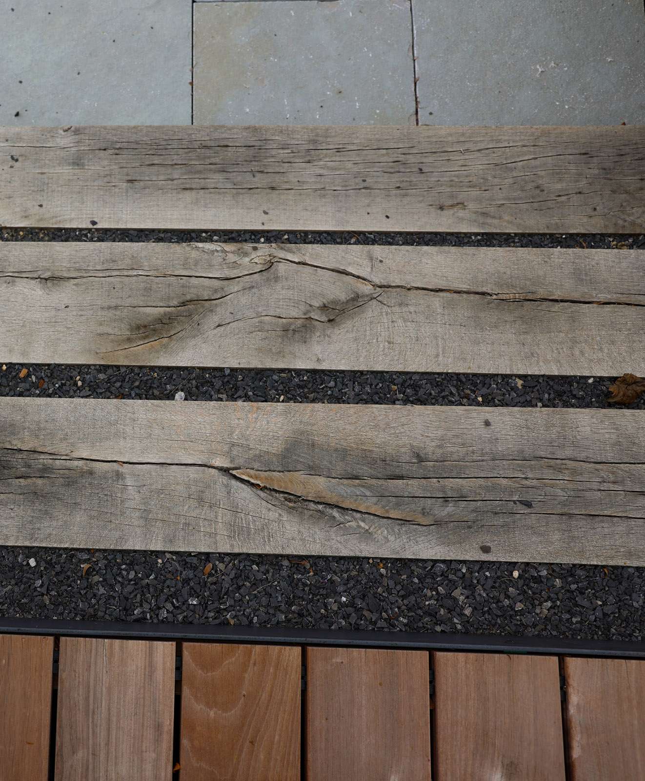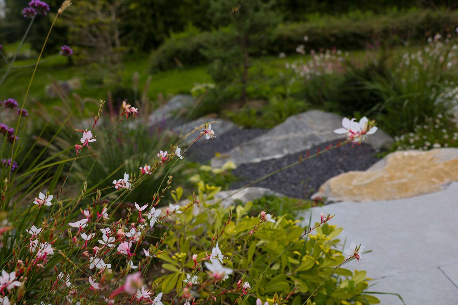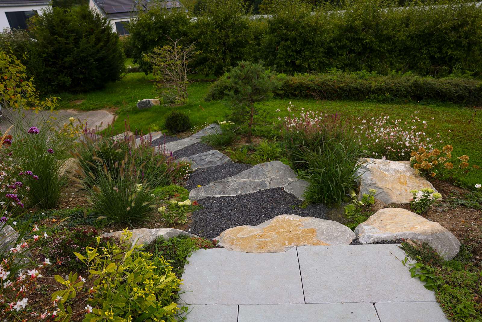 Escaliers et revêtement en pierres naturelles, terrasse en bois, passe-pieds et marches en poutres de chêne, plantations diverses autour d’une villa